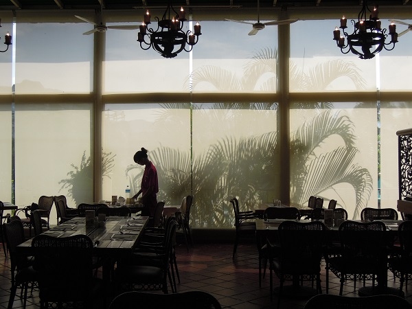里拉西餐廳早上被東昇的太陽給吵醒,已經開始工作的員工在窗簾前面,看起來特別美。
