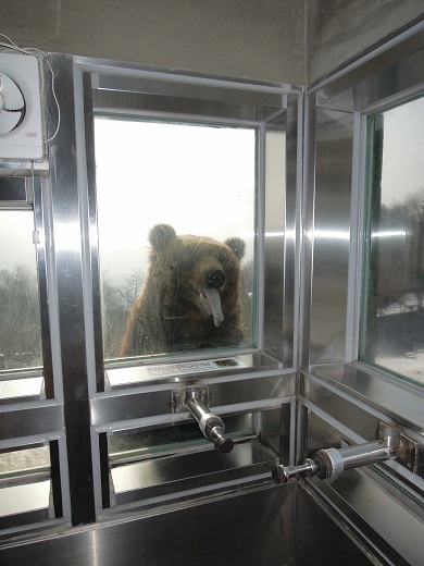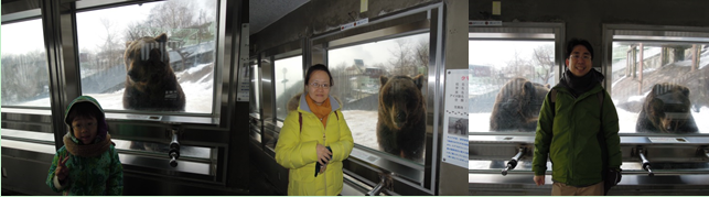 其實從照片上看是很平和的,但現場熊為了得到管子裡的食物,一直在不停地用頭撞擊玻璃,還發出低沉的吼聲,整個小屋有種風雨飄搖的無力感。牠們要是真的撞破了玻璃,我們就再也笑不出來了。(http://youtu.be/KcTlzBdefgQ)